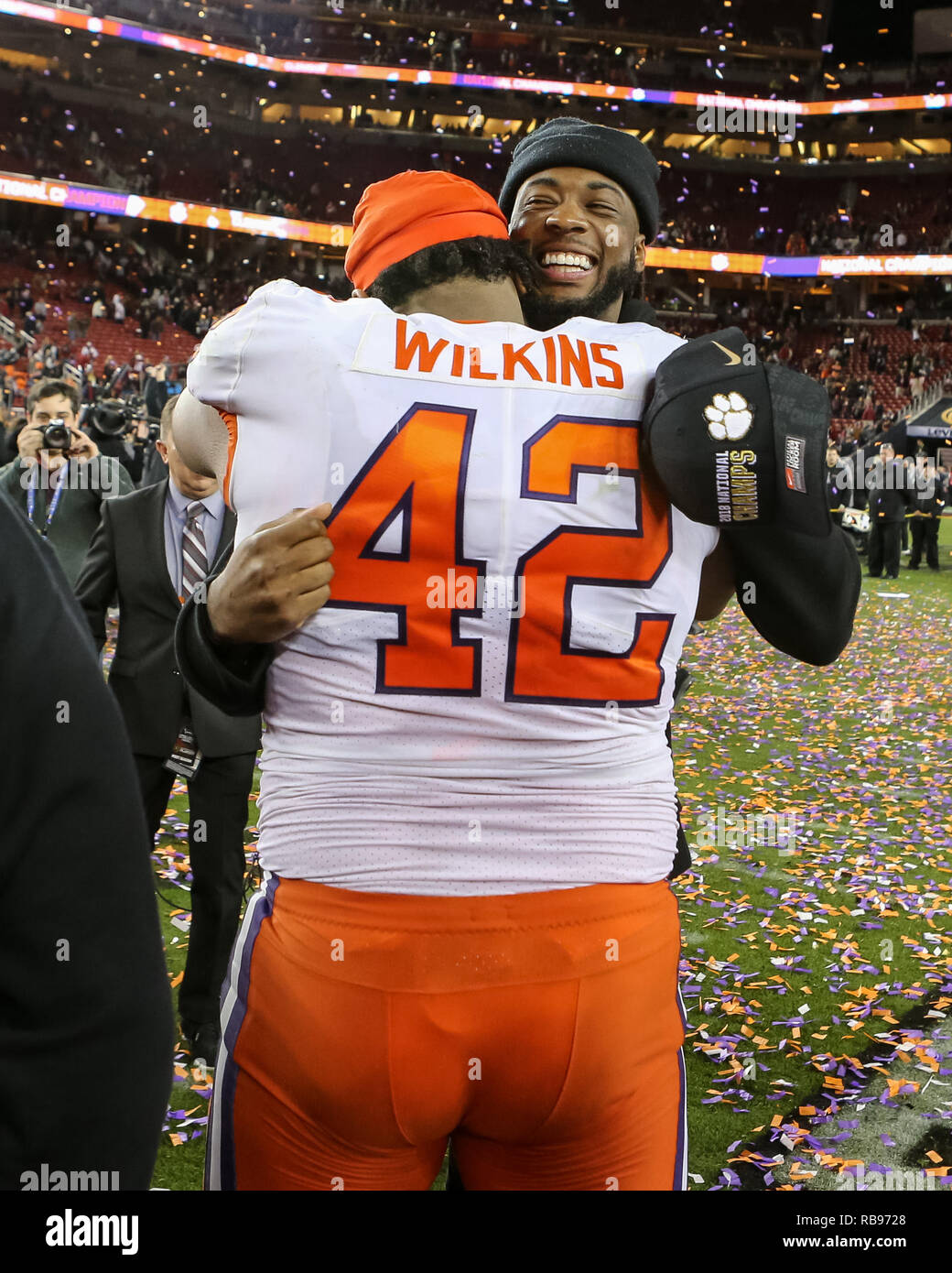 San Jose Ca 07th Ene 2019 Clemson Tigers Lineman Defensivo Christian Wilkins 42 Abrazos Ex Companero Cargadores De Los Angeles Mike Williams Despues Del Alabama Vs Clemson Campeonato Nacional Del Juego En